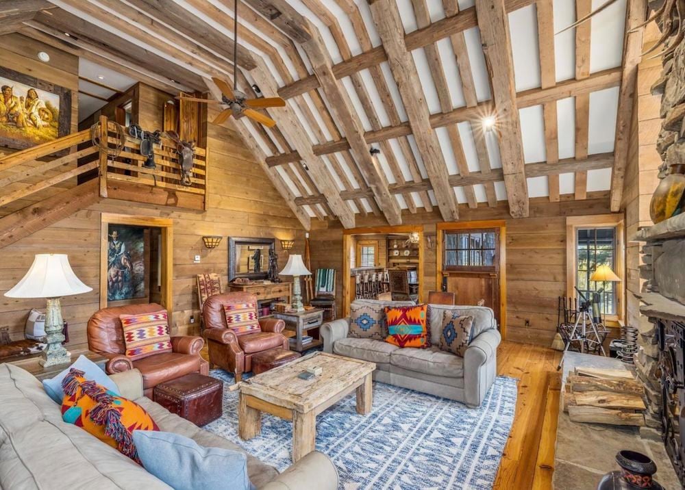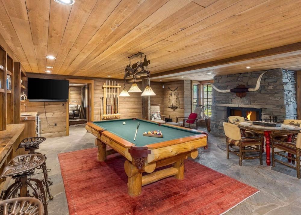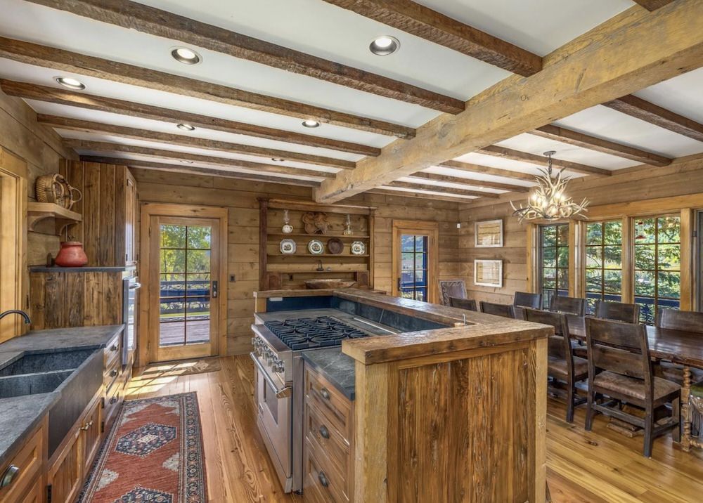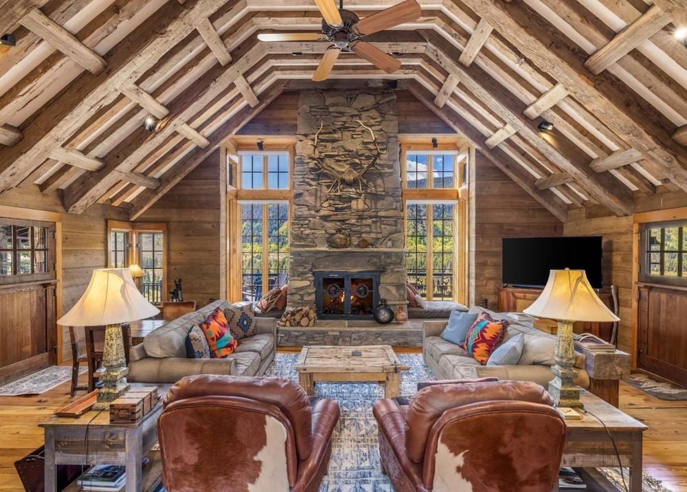 The 5,288 SF main home exudes relaxed sophistication is anchored by wide stone chimneys, wrapped in reclaimed Georgian cypress paneling, and designed with gathering in mind. Expansive living areas open to a wraparound porch and lower patio with hot tub, where the outdoors is always within reach.