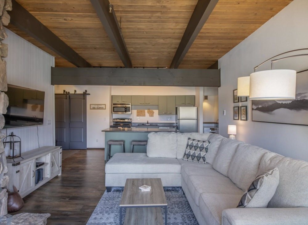 As you step inside, you'll be greeted by the high ceilings adorned with rustic wood beams which add a touch of mountain charm to the modern interior. The current owners have completely remodeled the unit, adding touches that elevate both aesthetics and functionality.