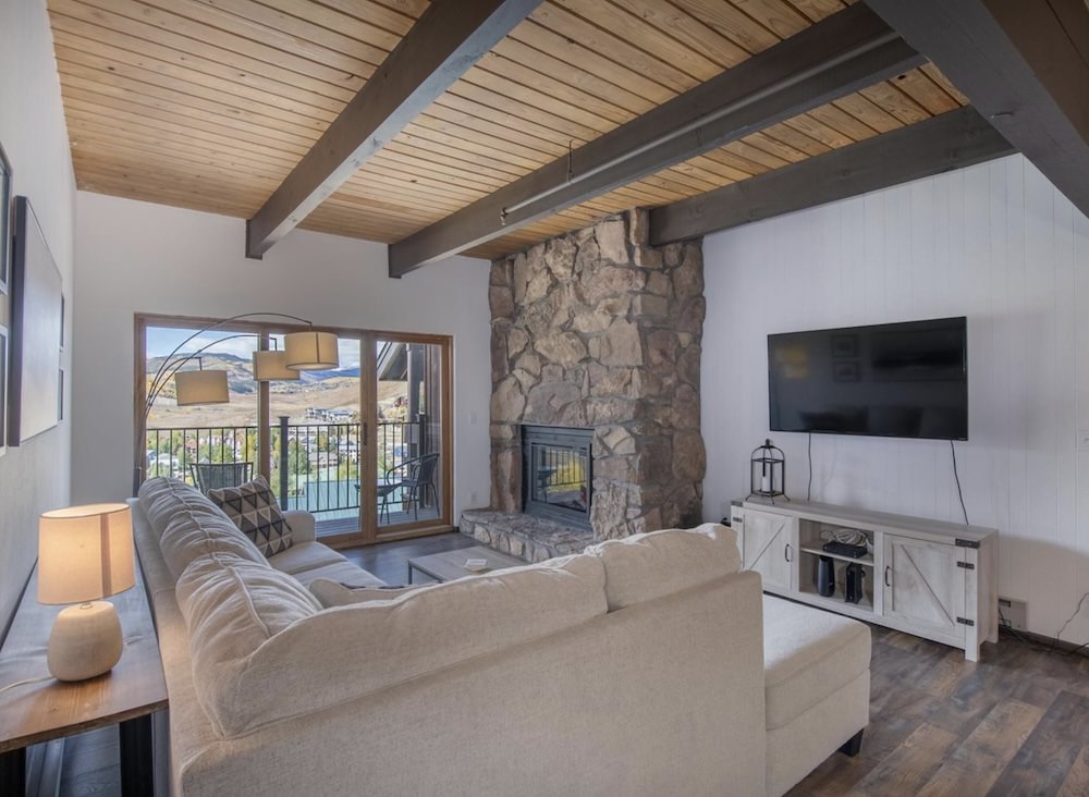 The centerpiece of the living space is the stone chimney with electric fireplace insert, creating a warm and cozy atmosphere after a day on the slopes. One of the standout features of this condo is its panoramic mountain views.