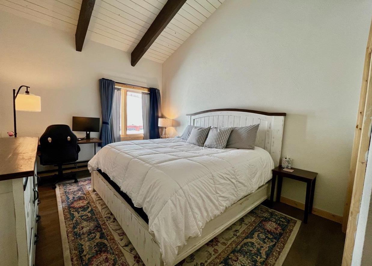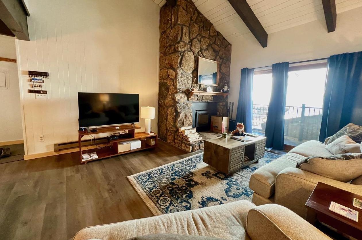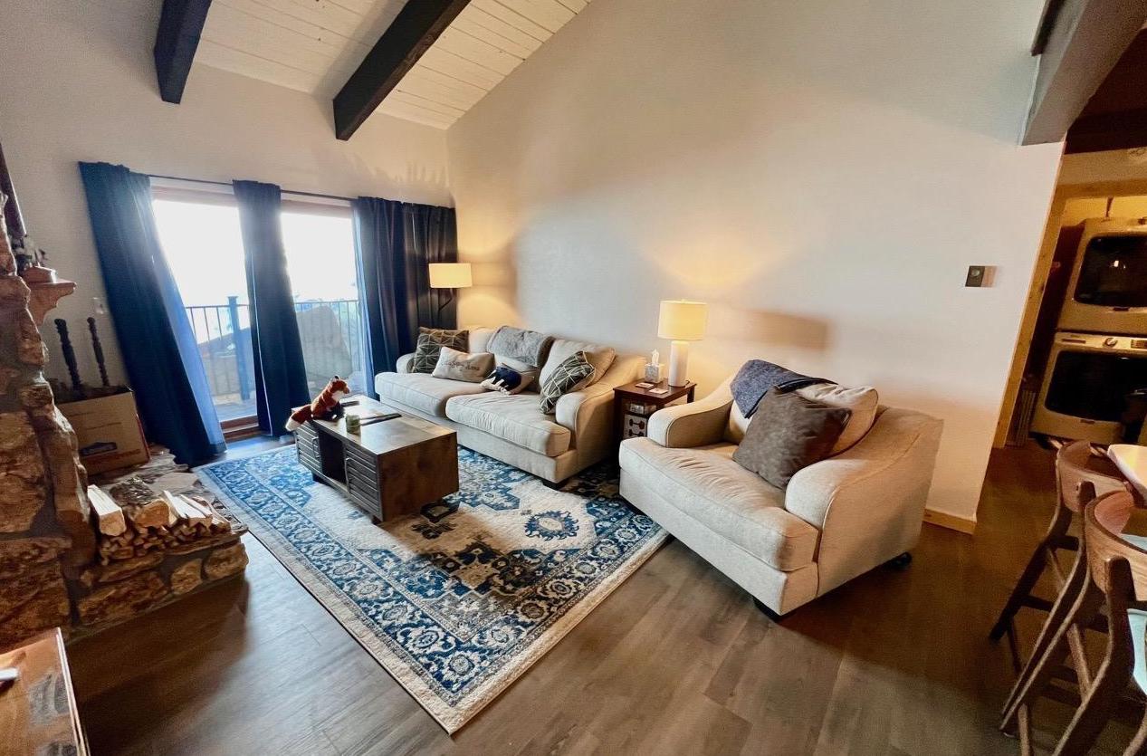 The living area is generously sized, featuring vaulted ceilings and a cozy wood-burning fireplace. Adjacent to the main level primary bedroom, you'll find convenient stackable washer and dryer units.