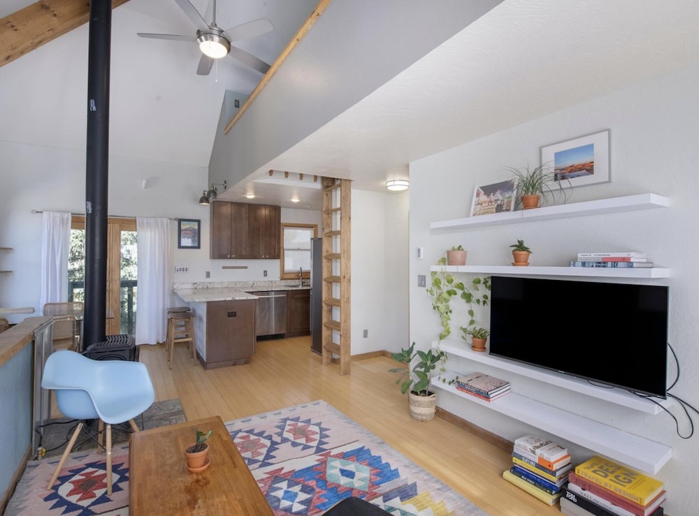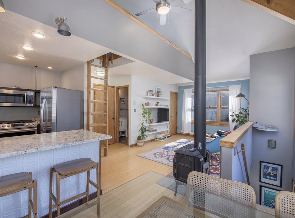 The floor plan offers an open layout complete with dining nook, kitchen, and living room. You’ll love the vaulted ceilings and newly installed free-standing gas fireplace, both of which contribute to the cozy and inviting atmosphere.