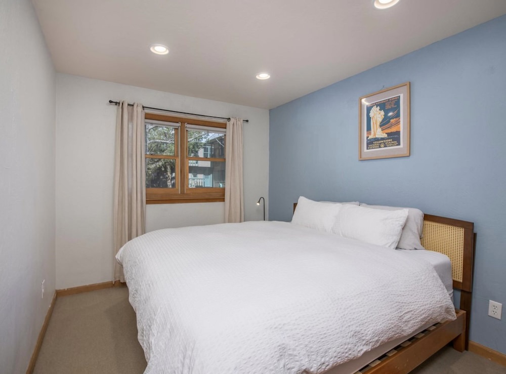 Entering the condo from the ground level, you’re welcomed by the spacious entry way and mudroom. On this level you’ll find both bedrooms— one of which is currently being used an office— and a full bathroom. This level has been tastefully updated with new knotty alder doors and trim, as well a new bathroom vanity and mirror.