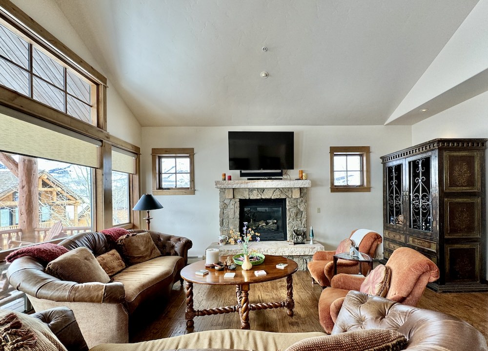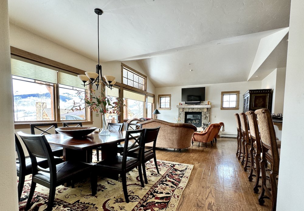 The home also showcases stunning hardwood floors in the living and dining areas. Vaulted ceilings in the living room and kitchen create an open, spacious atmosphere, complemented by a charming stone fireplace – perfect for unwinding after a day on the slopes.